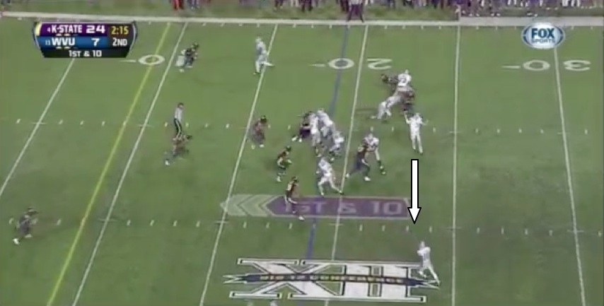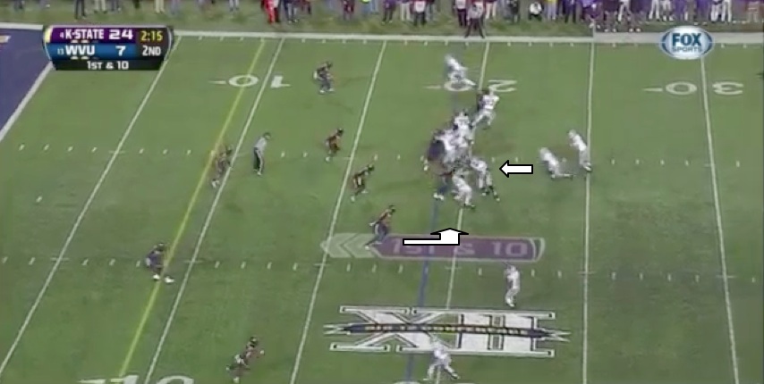 Credit the Kansas State coaching staff for knowing what they have and taking advantage of Klein’s diverse skill-set. The still-shots below are an example of the Wildcats using Klein’s versatility to put defenders in compromising situations and force them to play with hesitation.