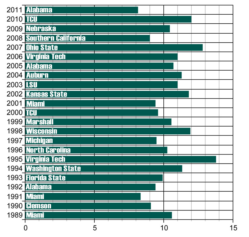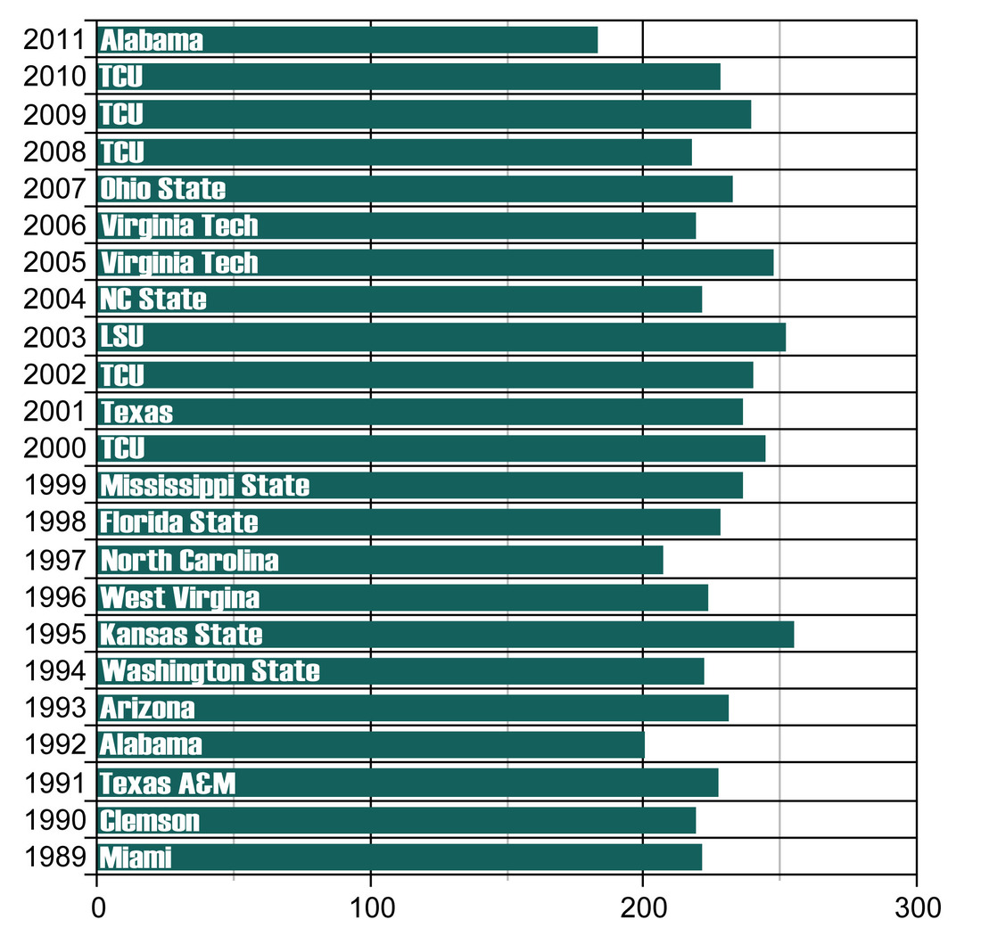 To get a year-by-year comparison using the NCAA numbers that are available I went back and looked up all the bowl numbers for the top five teams in each category for every available season, recalculated the average and came up with the season leader in these two categories. The charts and graphs that follow are the result.