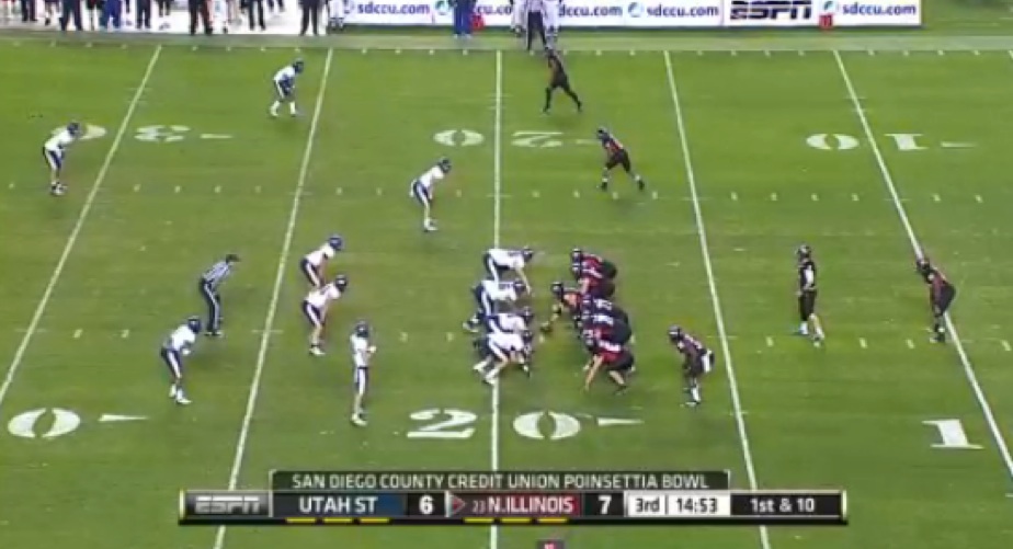 While the Aggies presented multiple looks at the Husky offense, one common look had Utah State shift their coverage towards the side with the slot receiver, with an athletic linebacker aligning between slot and tackle. He is the key to containing Lynch running outside on read plays, with a safety moving up to cover the slot and the defensive end crashing down.
