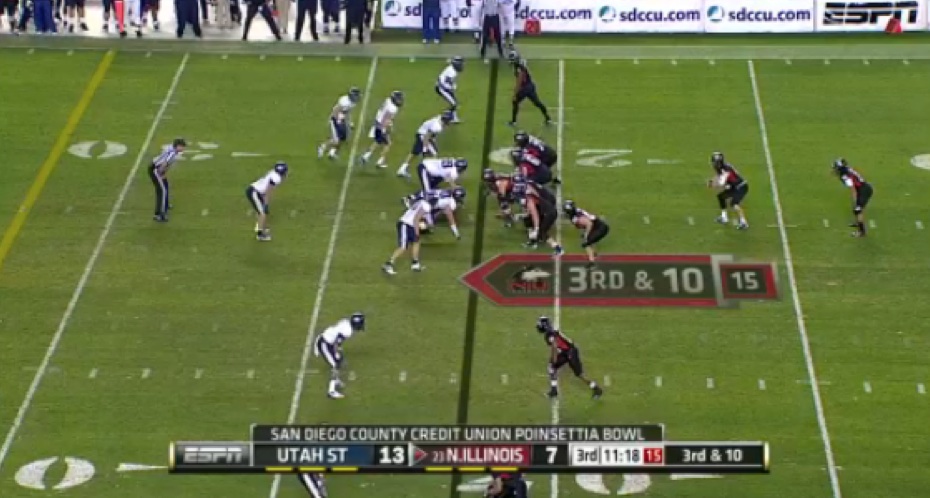 Throughout the game Utah State turned to this two down linemen look, but still was able to pressure Lynch and collapse the middle of the pocket. While this is damning for the interior of the Husky offensive line, Lynch also attempted to scramble too early without seeing open receivers.