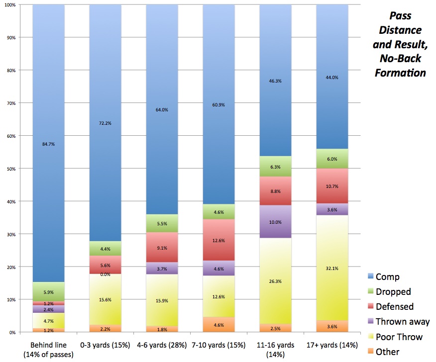 The general appeal of the no-back is at least partially because it offers quarterbacks both easy reads and easy throws. About 57 percent of the time, a quarterback's pass is travelling fewer than seven yards from the line of scrimmage. The completion rate for such passes is dramatically high; for passes thrown behind the line of scrimmage (typically a bubble screen), there is an 85 percent completion rate. And if you include drops and defensed passes (which are typically on passes considered catchable, yes?), a quarterback is going to throw a semi-accurate pass on a behind-the-line pass about 92 percent of the time. For passes between zero and 10 yards from the line of scrimmage, the percentage is about 80 percent, though obviously a defender is more likely to make a play on the ball the further you get from the line.