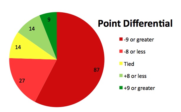 Our data showed the overwhelming majority of fourth downs, nearly 75 percent, were attempted by the trailing team. This makes sense as the trailing team has a greater urgency to score than its opponent. When charted to show the point difference between teams (see below), the data showed that not only were most teams trailing, but they were behind by more than a touchdown.