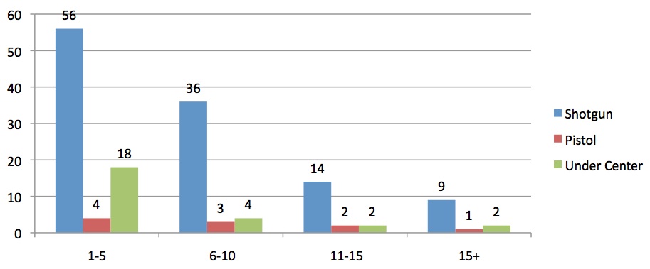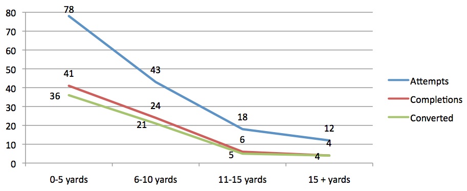 Not surprisingly, short yardage passing situations, where the threat of a run was conceivably high, resulted in a 20% higher completion percentage (54.5%) than fourth-and-long situations where the run was an unlikely option (33%). The dramatic drop in completion percentage on fourth-and-long can be attributed to a number of causes including defensive pressure, additional defensive backs and other factors, but surprisingly the number of fourth downs that were converted on longer plays actually increased. I don’t have any hard data to explain this trend, but it is likely that bubble screens, passes into the flat, and short crossing routes resulted in higher completion percentages but required receivers and available blockers to fight for the yardage necessary to move the chains. Whereas, in distances of greater than ten yards, less emphasis was placed on yards after the catch, and instead receivers needed only to reach the down marker before the ball was delivered.