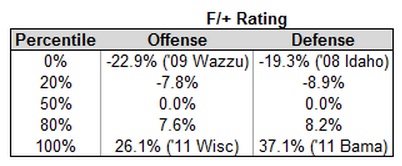 I love F/+ ratings, and I really appreciate the work that goes into them, but I have to admit that sometimes I don’t really know how to use them. My goal with this post will be to make these figures a little easier to digest using some visuals.