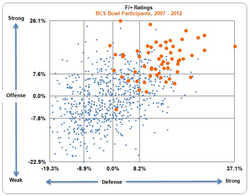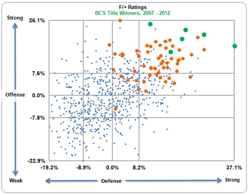 This pretty clearly shows that you need to be truly elite to win the BCS title -- the F/+ ratings say these teams truly are the best of the best. There are plenty of orange dots surrounding the green ones, signifying BCS bowl teams that did not win the title, so being up in the extreme northeast corner doesn’t assure you of winning the big game -- but in order to win it, you need to be really special on both sides of the ball.
