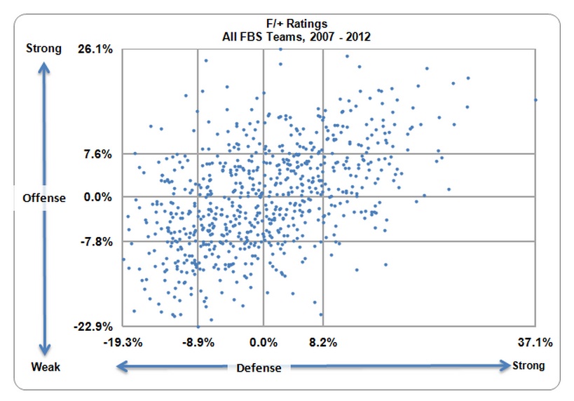 Here’s my method. Going back through the 2007 season, I took every FBS team’s offensive and defensive F/+ ratings and plotted them on the chart below, so each blue dot represents a single team. This is a group of 723 teams over a 6-year period (go ahead, count the dots). The key points to remember in this post: