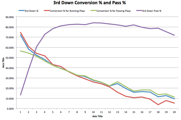 I'm not really sure what value we can gain from this chart. Teams start passing the ball more than half the time at about three yards to go from a first down. While teams quickly pass the ball more than they run the ball, the conversion % is actually pretty stable. It is only until teams have seven to eight yards to go for a first down that the percent of passing plays that gets you a first down is higher than the same percentage for running plays. But, teams are also passing the ball four times out of five at this point. It's possible that when teams run the ball at this distance, they have noticed that a draw play will fool a defense or something like that. The third-and-13 spike is still there, and thanks to all those in the comments of the previous post, I'll be investigating some of the ideas you guys had in the future.