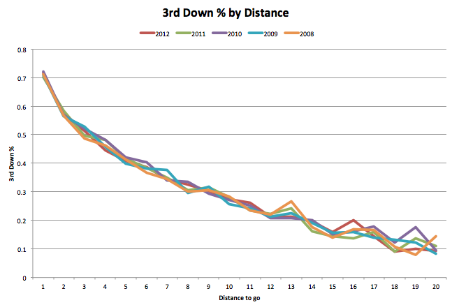 And here are google doc links to the raw data for total third downs by distance for each team in 2012, and the final conversion numbers that the chart pulls from for all seasons since 2008.