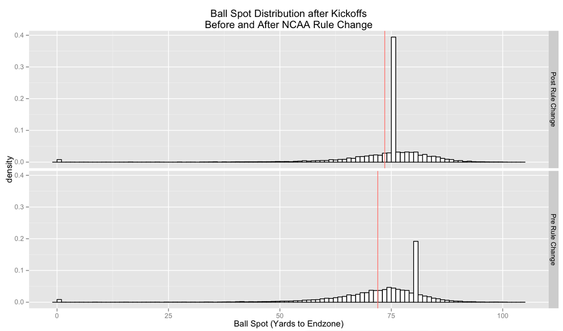 The main effect of the rule change is definitely the touchback frequency, the spike at your own 25 yard line is huge. But other than that, there have only been small shifts in kickoff returns. In total the new kickoff rule changes moved the receiving team back by about an extra yard and a half per drive on average. Teams used to start the drive with about 72 yards to go, and teams now start their drives with 73.5 yards to go, on average. We actually could have calculated this without using any data on returns whatsoever. If we assume that 35% of kickoffs in 2012 were going to get the 5 yard boost from the new touchback spot, our average start spot would increase, in favor of the offense, by 1.75 yards (.35*5). If we assume that the other kickoffs that were returned had a 5 yard penalty from the new kickoff spot, that would hurt the offense by 3.25 yards (.65*5). Adding these together and we get a difference of 1.5 yards in favor of the kicking team, and this is exactly what we see empirically. The change, or lack there of, in return length had no affect on the average start spot of a drive. It was entirely driven by the change in kickoff spot and touchback spot. What do you guys think? Any other changes that might have occurred that I missed? Put them in the comments.