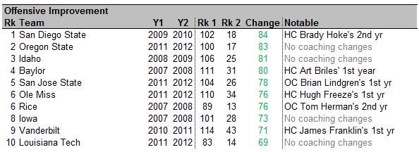 First up: offensive improvement. Over the past five years, these teams improved the most in offensive F/+ ranking from one year to the next. For example, the top team improved from 102nd in F/+ in 2009 to 18th in 2010.