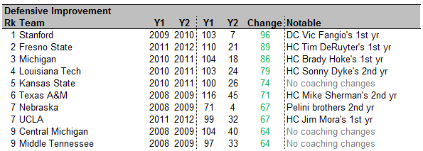 Pretty solid group of coaches on this list. The average team moves around 22 spots in defensive F/+ from one year to the next. Defense seems to be a little more "sticky" than offense -- a little bit less movement from one year to the next. Maybe because it is more reliant on scheme than talent? Thoughts?