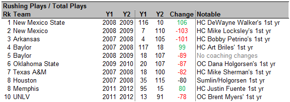 As you would expect, the list is almost entirely made up of 1st year coaches who are making wholesale changes in offensive philosophy. The only exception: Art Briles ran the ball a ton in his first year (62% of total plays). In his second year, he changed gears, running only 45% of the time.