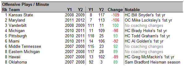 Once again, several 1st-year coaches or coordinators that are installing a new offensive philosophy. Bill Snyder slowed things way down in his first year taking over for Ron Prince. Todd Graham did just the opposite at Pitt in 2011. Oklahoma is an interesting case. This was Kevin Wilson's 7th year as offensive coordinator at Oklahoma. He recognized what he had in sophomore Sam Bradford and ran shifted into high gear, running a much more up tempo offense in 2008. Bradford won the Heisman and the Sooners made it to the BCS title game against Tim Tebow.
