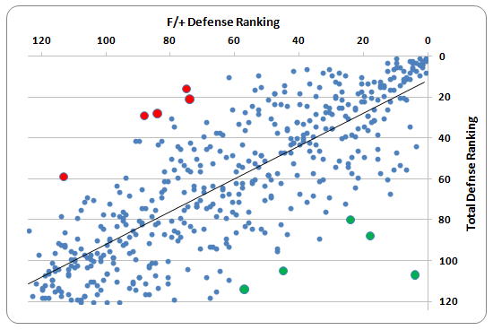 - The 5 dots in red represent teams that are significantly worse in F/+ than they are in total defense.