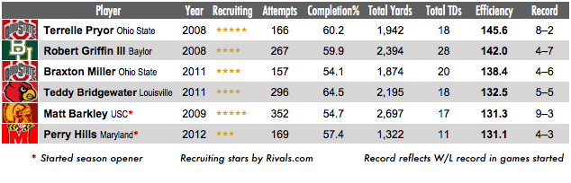 This… well, this is a pretty good group, although with a few exceptions you would not have necessarily thought so watching them at the time. Pryor and Barkley were both unanimous five-star recruits who led their teams to at least one top-ten finish in the polls, and both currently reside on NFL rosters. (Pryor was part of three consecutive Big Ten titles and three BCS bowls, winning two; he left Columbus in turmoil, but with a 31–4 record as a starter. For his part, Barkley missed his shot at the BCS in 2011 due only to NCAA sanctions.) Miller was a borderline four/five-star recruit who set the Ohio State record for total offense en route to an undefeated season as a sophomore, and is arguably the frontrunner for the Heisman Trophy as a junior. Bridgewater, a much-hyped recruit in his own right, is by far the most coveted quarterback among pro scouts after lighting up Florida's blue-chip defense in the Sugar Bowl. RG3 is RG3. These are the only guys who generally succeeded as true freshmen, and that's only if you define success as being average.