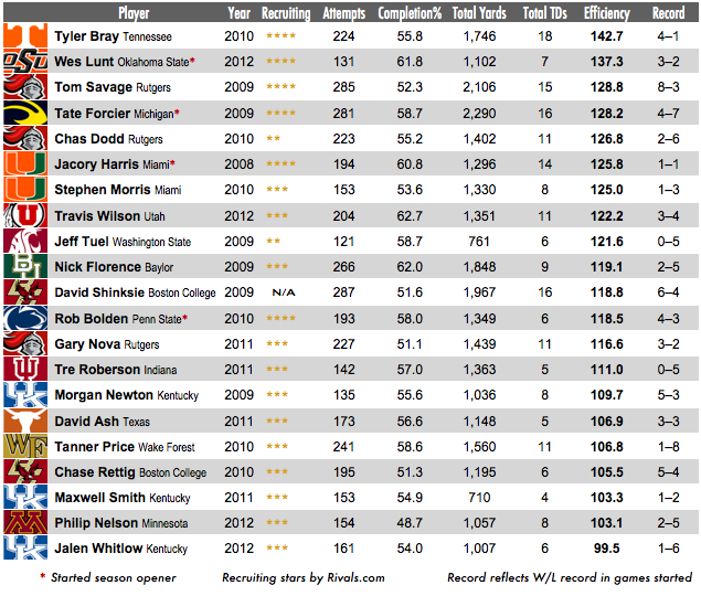 But that project lumped in redshirt freshmen with the guys coming directly from high school, and the subsequent years have dramatically widened the gap between those two categories. (Future quarterbacks can thank Andrew Luck, Kellen Moore, Taylor Martinez, Aaron Murray, Johnny Manziel, Brett Hundley and Marcus Mariota for wrecking the redshirt curve.) No first-year passer has made remotely that level of immediate impact. Among true freshman quarterbacks in the six major conferences over the last five years, in fact, only six have both a) Started a majority of their team's games, and b) Finished with a pass efficiency rating above 130, roughly in line with the national average:
