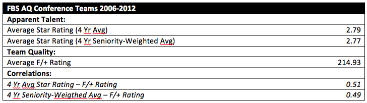 Not surprisingly, there was a definite and fairly strong correlation between Apparent Talent and team quality (as measured by F/+). The correlation coefficient between the simple 4 year Average star rating and the Predictor was 0.51. Interestingly enough, the correlation with my age-weighted model was actually slightly lower, at 0.49. This was based on sample of 466 observations: all seasons for teams in the ACC, Big East, Big 10, Big XII, Pac-10/12, and SEC from 2006 through 2012.