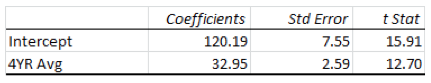 As it turns out the leverage of apparent talent on team quality is a lot less than a 1:1 ratio. In fact, based on the regression, the leverage (or Beta, or slope of the regression line) is approximately 0.46. Simply stated, at team with 40% better than average talent (for an FBS AQ school) would be expected to be 18% better than the average FBS AQ team in terms of F/+ rating.