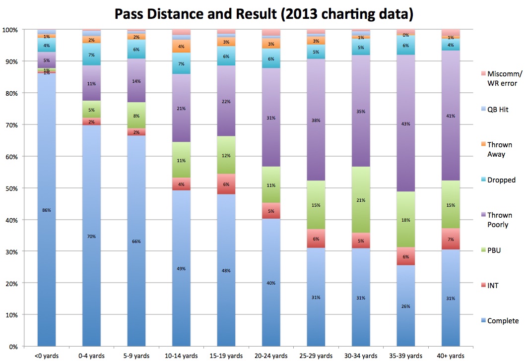 For all passes in this sample, the results for a given pass are distributed as follows (in descending order): Complete (61.5%), Thrown Poorly (17.0%), INT/PBU (11.2%), Dropped (6.0%), Thrown Away (2.2%), QB Hit (1.2%), Miscommunication/WR error (0.9%). As throws get longer, completion rate drops, and the "Thrown Poorly" and INT/PBU rates increase. That's pretty much what we would expect.