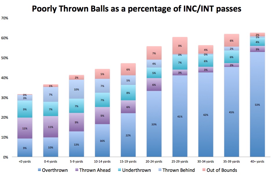 Most "poorly thrown" passes are overthrows, but as we see here, the longer the pass, the more likely it is to be over- or underthrown, and the less likely it is to be thrown ahead/behind. That's basically the nature of the pass itself. Most over- or underthrown passes are going to involve a receiver running vertically and are therefore probably going to be longer balls. Passes thrown ahead or behind the receiver are likely to involve a receiver running horizontally or diagonally at a shorter distance