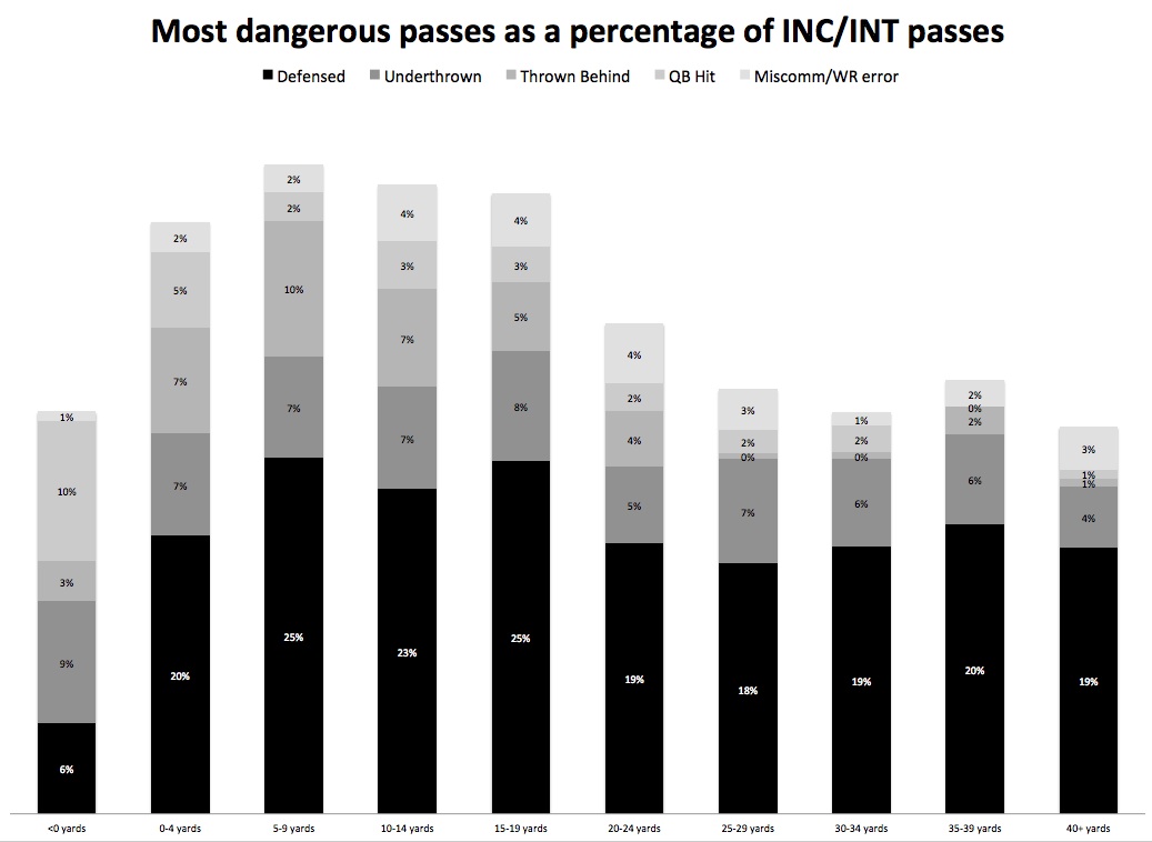 Again, put aside for a moment the idea of the "PBU." Charting data suggests that certain types of incomplete passes are more likely to become interceptions than others, namely "Defensed" passes (which, as used by charters, simply means the defender breaking on an otherwise accurate ball), underthrown passes, passes thrown behind a receiver, passes in which the QB is hit as he throws, and passes that involve miscommunication or receiver error (like falling down). Overthrowing your target or throwing ahead of him is pretty common and relatively safe, but when you underthrow or throw behind him, defenders are more likely to be in the vicinity.
