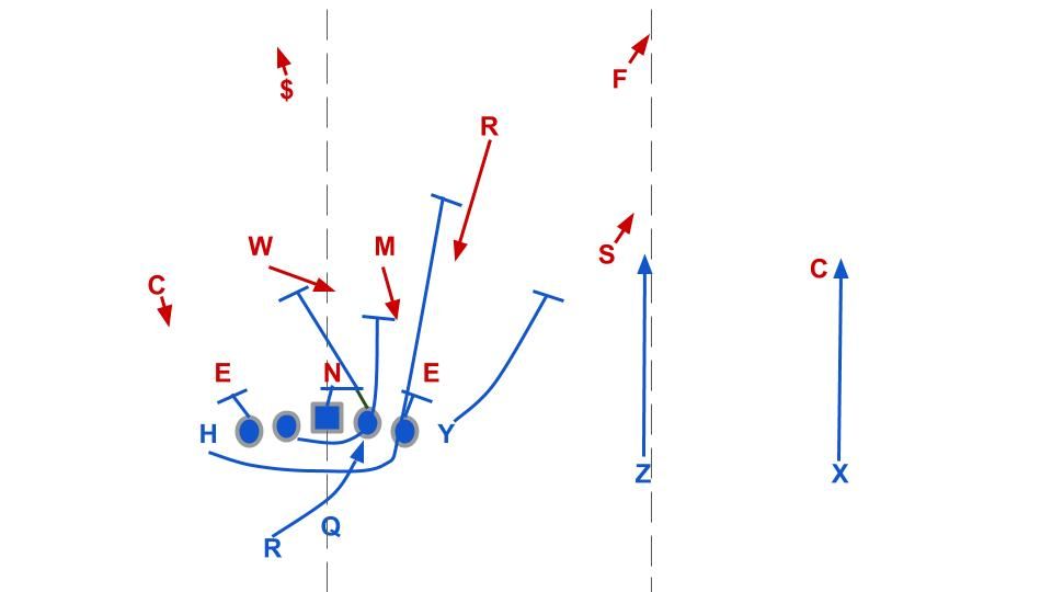 This play is basically inside zone tweaked to recreate the classic “weak side Iso” downhill running play. Most of the OL zone blocks to the left looking to combo up to the play side linebacker while the backside tackle “solo” blocks the backside end to keep him outside and the H-back loops around to lead up to the backside linebacker. The play is intended to cutback behind the lead block but the zone steps make it hard for the play side LB to get back to help against the lead block because he’s thinking he needs to stay there to maintain a gap.