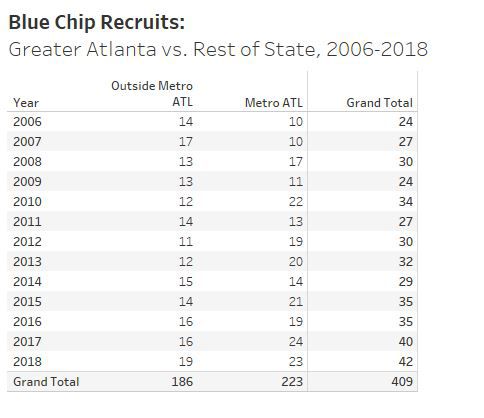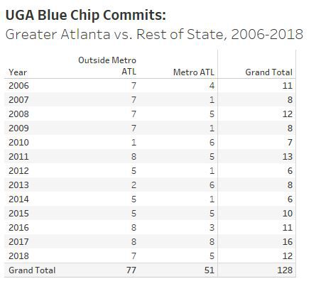 Applying the same filter to UGA’s blue-chip commits illustrates the fact that the Bulldogs have a much greater pull for top tier recruits outside of the Atlanta metro area than within it.