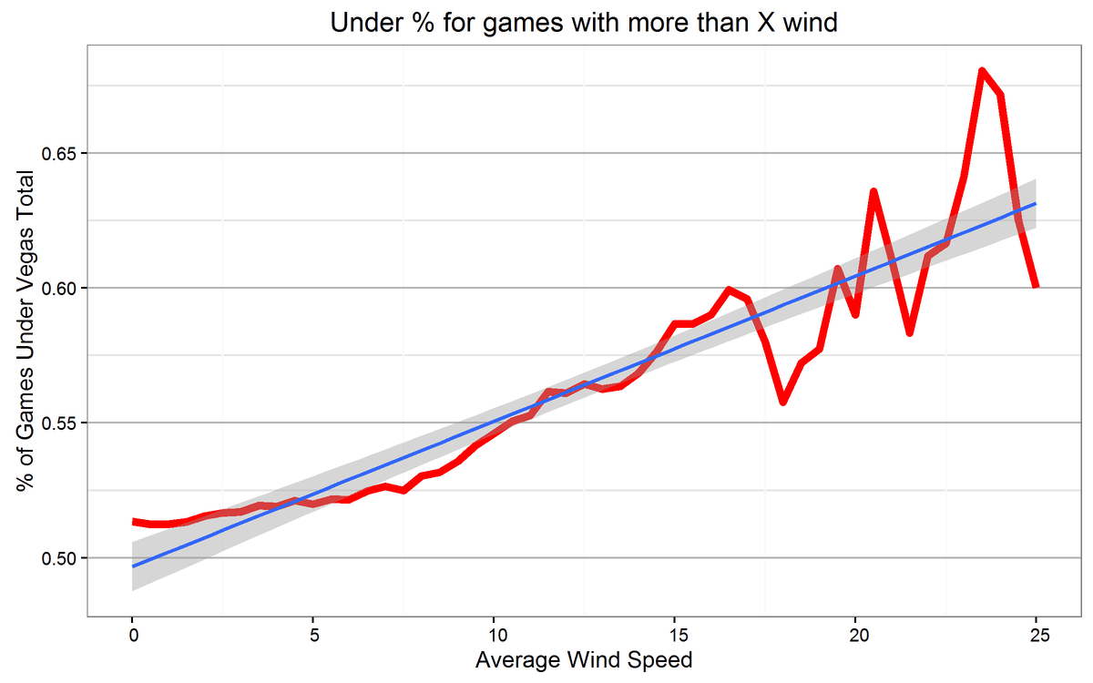 Here’s what that means: for ALL games greater than 10mph, about 55% of them are under, for all games over 15mph about 58% are under, all games above 17 mph will have 60% under the total. Beyond 17mph you start to lose reliable sample size (only 250 games).